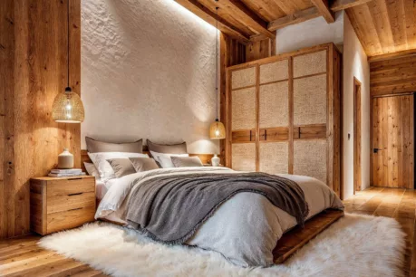 Au cœur du séjour, la cheminée à foyer ouvert dessine le point de gravitation naturel de la maison. C’est autour d’elle que l’on se retrouve, au retour des pistes de l’Espace Killy, avant un dîner qui se prolonge jusqu’à ce que la lumière se retire des sommets, et que la chaleur du feu s’installe. Ce refuge accueille avec générosité, tout en préservant son intimité.